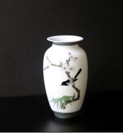 “一樹獨先天下春”瓶,瓶高20cm,口徑為8cm,足徑為5.5cm,器型俗稱為藕瓶。瓶型線條簡潔流暢端莊。因以大球泥為主要原料制成,故瓶胎體晶瑩剔透,畫面特別溫潤。藝術大師以“鵲鳥聲喈喈,枝頭好落。淡淡東風色,暗香微動,天下春”的寓意而將作品題寫為“一樹獨先天下春”,詩情畫意躍然于瓶上,是一件難得一見的珍稀藝術品。