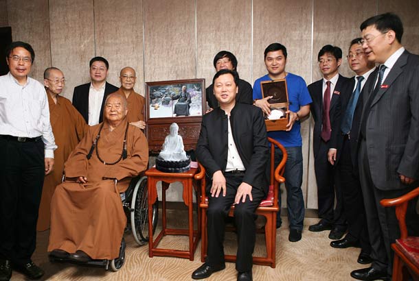 2014年11月10日上午許,在旅美畫家李自健先生的長沙創(chuàng)作室,大球泥瓷藝董事長滕召華親自請了一尊潔白如玉的《多寶佛》(釋迦牟尼佛瓷塑像)給李自健先生,并向大家介紹說,“今年初,我最開始有用珍稀原料大球泥塑造佛像題材的想法時,得到了李老師的支持。在創(chuàng)作‘釋迦牟尼佛瓷塑像’的過程中,李老師更是給了很多寶貴的意見,他希望我們能塑造出有世界聲望的佛雕作品。在李老師的引薦下,今年5月30日,我又有幸與臺灣佛光山開山宗長星云大師結緣,并將001號‘釋迦牟尼佛瓷塑像’捐贈給星云大師永久收藏于佛光山。”