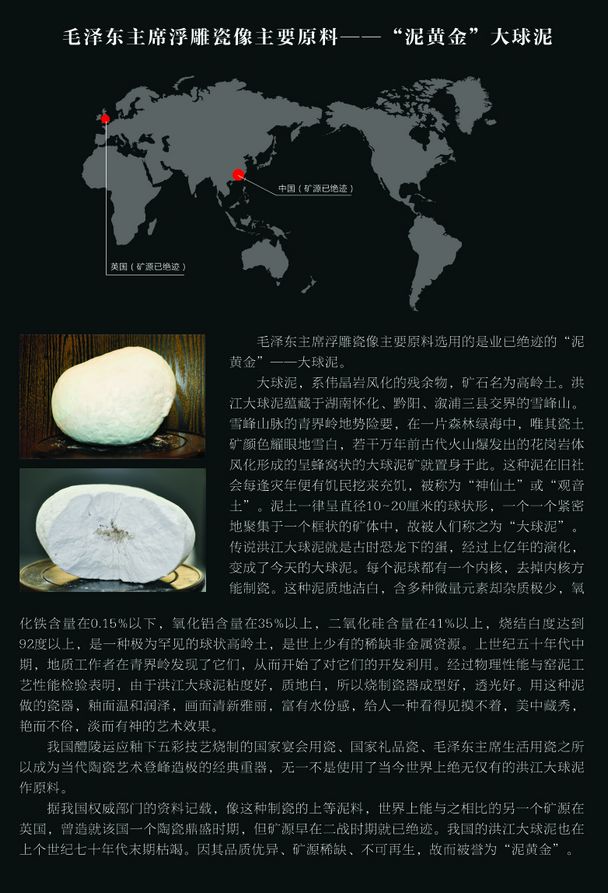 大球泥是偉晶巖風化物,雪白球狀體,形似恐龍蛋;含鋁量極高,含鐵量極少,是制作陶瓷的稀缺原料。至今世界只發(fā)現(xiàn)兩個礦源,一個是英國,二戰(zhàn)時枯竭;一個是湖南雪峰山,上世紀八十年代枯竭,F(xiàn)存于世就一百多 噸,絕大部分被大球泥瓷藝公司搶救性保護收藏,并審慎研究、開發(fā)、利用。