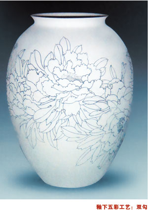 裝飾紋樣結(jié)構(gòu)嚴(yán)謹(jǐn),造型簡(jiǎn)練。不輕佻、不淺薄,不矯揉造作,給人莊重、大氣的美感,藝術(shù)上十分耐人尋味,使人親近。醴陵釉下五彩瓷這一獨(dú)到風(fēng)格的形成,與它特有的那種雙勾汾水彩飾技法有著密切的聯(lián)系。“雙勾汾水”是醴陵釉下五彩的精髓,也是醴陵釉下五彩的秘笈。彩繪中先用線條勾勒?qǐng)D形輪廓,再以汾水法填以色彩。勾線表現(xiàn)出高超的技巧,使之富有濃厚的裝飾特征。所勾出來(lái)的墨線和色線十分奇特,色線根據(jù)預(yù)設(shè)的顏色燒成后呈現(xiàn)鮮艷的色調(diào),墨線則在一定溫度下消失,呈現(xiàn)空白線條。汾水則不僅要求色彩平坦,并且要呈現(xiàn)出多種層次,因而要運(yùn)用罩色與接色等多種技法。
