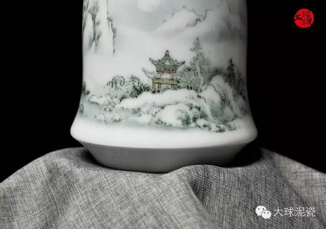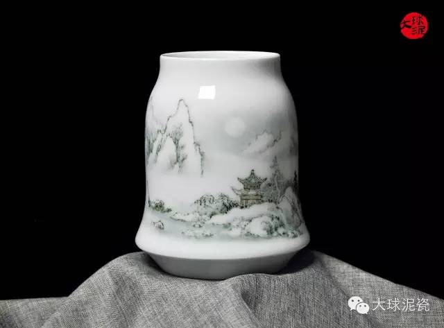《風(fēng)花雪月》收口瓶,以大球泥為原材料,由工藝美術(shù)大師張志堅(jiān)創(chuàng)作。瓷質(zhì)潔白泛青,透露出水一般的飽滿(mǎn)潤(rùn)澤,造型渾厚大方,圓渾穩(wěn)重,給人以寧?kù)o安詳?shù)撵o態(tài)美。瓶身的畫(huà)面以山水為創(chuàng)作題材,主次分明,對(duì)比強(qiáng)烈,給人包容萬(wàn)物的和諧之美,反映出作者對(duì)大自然的無(wú)限熱愛(ài)和深厚的文化底蘊(yùn)。