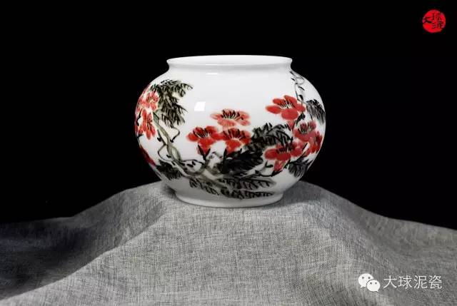 綠蔓如藤不用栽,淡青花繞竹籬開。 披衣向曉還堪愛,忽見晴蜓帶露來。 ——陳宗遠(yuǎn)·《牽牛花》 作品介紹 《壯志凌云》小瓷罐,描繪著一副在深秋的傍晚,紅艷艷的牽;ㄨ簿`放的情景。瓷罐上紅艷的牽;ê秃幕ɡ,點綴在以濃墨勾畫的枝葉藤蔓上,不僅映襯出牽;ǖ膵擅溃擦町嬅娓邔哟胃。一群從遠(yuǎn)處飛來的雀鳥,使得畫面活潑生動,令人感受到在這深秋蕭瑟的景色中,仍感覺到生命的活力。 從造型上來看,《壯志凌云》小瓷罐,圓身鼓腹,沉穩(wěn)而古樸,使得整件作品顯得更為高挺,其屹立之姿威武而雄壯。而瓷罐上描繪著在深秋的傍晚,一叢叢紅艷艷的牽;ㄓL(fēng)霜露盛開,其本意為不肯屈服現(xiàn)實的殘酷,以一種獨立、堅強(qiáng)、自信向人們展示的豁達(dá)之美。