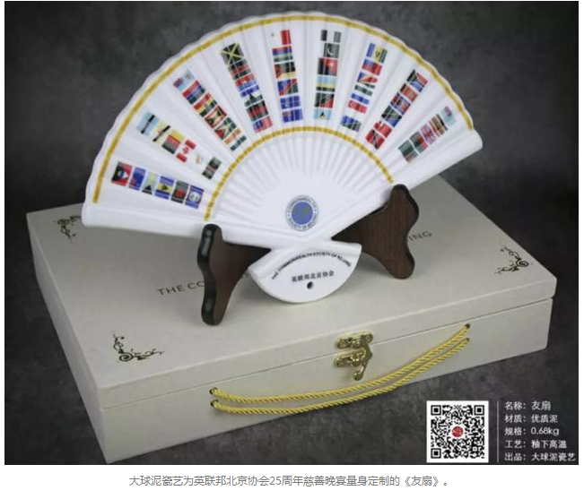 三個(gè)月前,大球泥瓷藝受邀為這次晚宴承制一套富有中國特色的禮品。經(jīng)過反復(fù)研討、設(shè)計(jì),最終選擇以中國折扇為造型,正面配以53個(gè)英聯(lián)邦成員國的國旗,背面選擇中國長城畫面,作品取名《友扇》,扇同善,寓意各國之間友好相處。