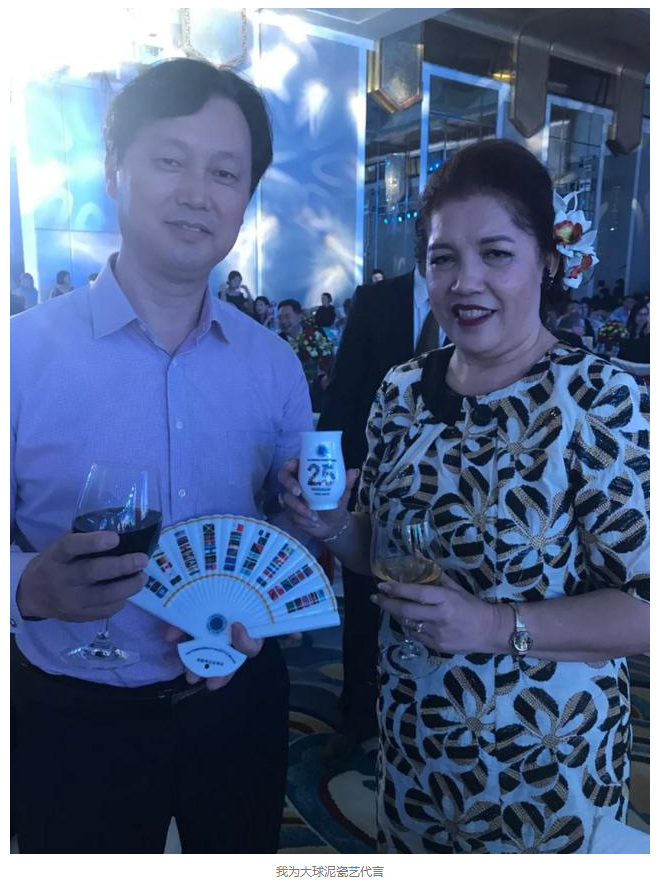 晚宴現(xiàn)場,大家紛紛拿起《友扇》和《牽手杯》進(jìn)行合影留念,薩摩亞大使和夫人silverina(協(xié)會(huì)主席)、塞浦路斯大使和夫人Nayuan(協(xié)會(huì)副主席)、匈牙利大使和夫人Mercedes Revy 等更是采用夫妻檔為大球泥瓷藝代言!