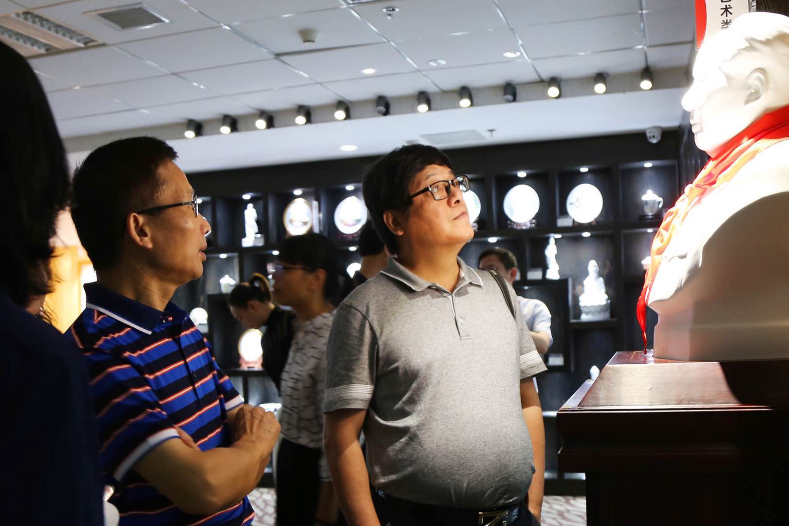 隨后考察團(tuán)移步到大球泥產(chǎn)品展示廳,參觀了紅色偉人系列、祈福平安系列、藝術(shù)收藏系列、生活定制系列、景區(qū)文創(chuàng)系列、外交國禮系列等產(chǎn)品(作品)。當(dāng)講解員把大球泥和優(yōu)質(zhì)泥同一器型的杯子放到燈光下后,考察團(tuán)一行都驚訝了,一個(gè)潔白、溫潤、通透,一個(gè)泛黃、暗淡、渾暈,異口同聲感慨到大自然的鬼斧神工,大球泥瓷實(shí)屬不可多得的瓷中精品?疾靾F(tuán)何團(tuán)長還挑選了一把壺上手,細(xì)細(xì)撫摸,慢慢回味,說大球泥瓷的感覺就是有說不出的爽!