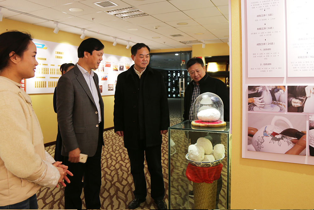 在滕召華董事長(zhǎng)的陪同下,毛主任一行參觀了公司的文化展廳和精品展廳,常務(wù)副總張萍做了精彩講解。從“藏寶”、“識(shí)寶”、“揭寶”、“護(hù)寶”、“探寶”、“惜寶”、“聚寶”、“鑄寶”、“傳寶”、“鑒寶”、“國寶”十一大板塊,深入淺出地講解了大球泥原料的稀缺性、公司的研發(fā)歷程、文化的提煉形成、產(chǎn)品的定性定位、未來的發(fā)展方向。毛主任一行看到公司七年時(shí)間里取得了那么多榮譽(yù),給予了充分肯定和高度贊揚(yáng)。