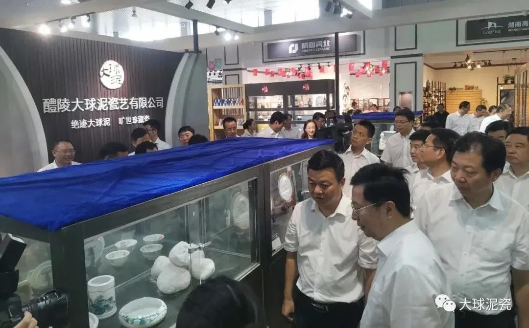 考察團(tuán)一行看到展柜內(nèi)上鎖保護(hù)的雪白球狀物時(shí),都很疑惑,株洲市委書記毛騰飛向胡衡華書記介紹說(shuō)這就是“毛瓷”的主要原料——大球泥。株洲市長(zhǎng)陽(yáng)衛(wèi)國(guó)介紹大球泥時(shí)如數(shù)家珍,說(shuō)它是燕山時(shí)期的偉晶巖風(fēng)化物,發(fā)掘出來(lái)就是這樣雪白的球體,每坨中心有一個(gè)“核”是雜質(zhì),全球只有雪峰山發(fā)現(xiàn)這個(gè)材料,它是制瓷的稀缺原料。