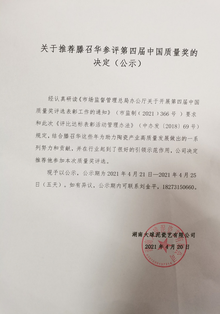 關(guān)于推薦滕召華參評第四屆中國質(zhì)量獎的決定(公示)