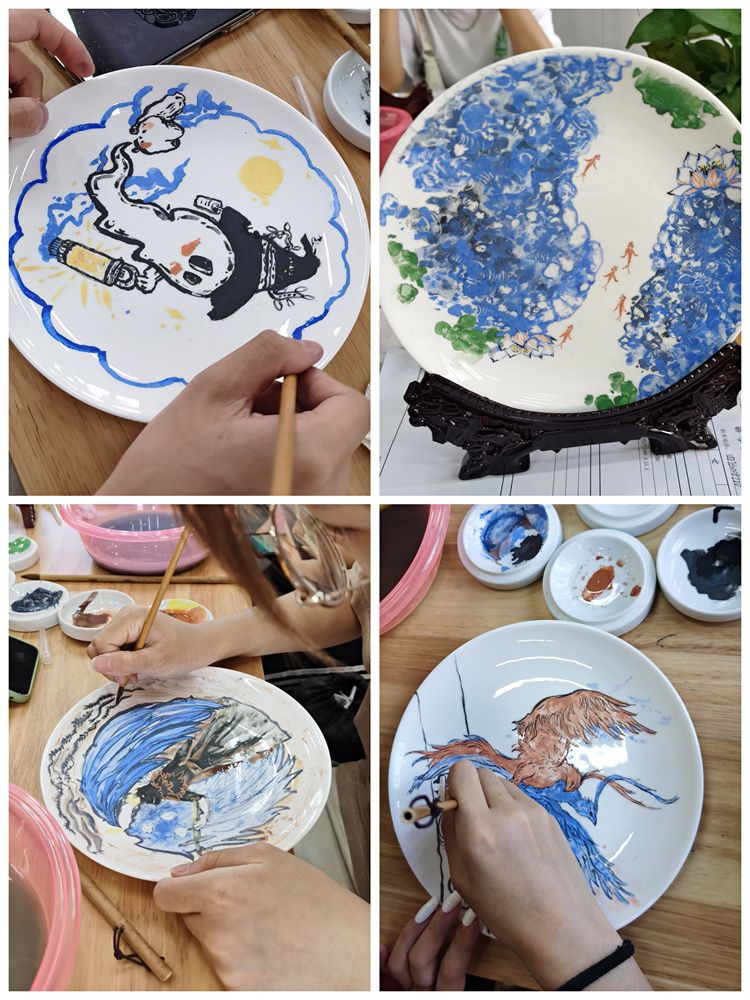 幾盤染料,幾支畫筆,幾種情愫,皆可描繪。也許是洪江古城印象,也許是心中家的思念,也許是向往未來生活,也許是內(nèi)心佳人形象。這批承載同學(xué)們美好祝愿的作品,上午繪畫、下午燒制、晚上降溫,明天可以到達(dá)學(xué)生手上,欣賞自己的研學(xué)成果。